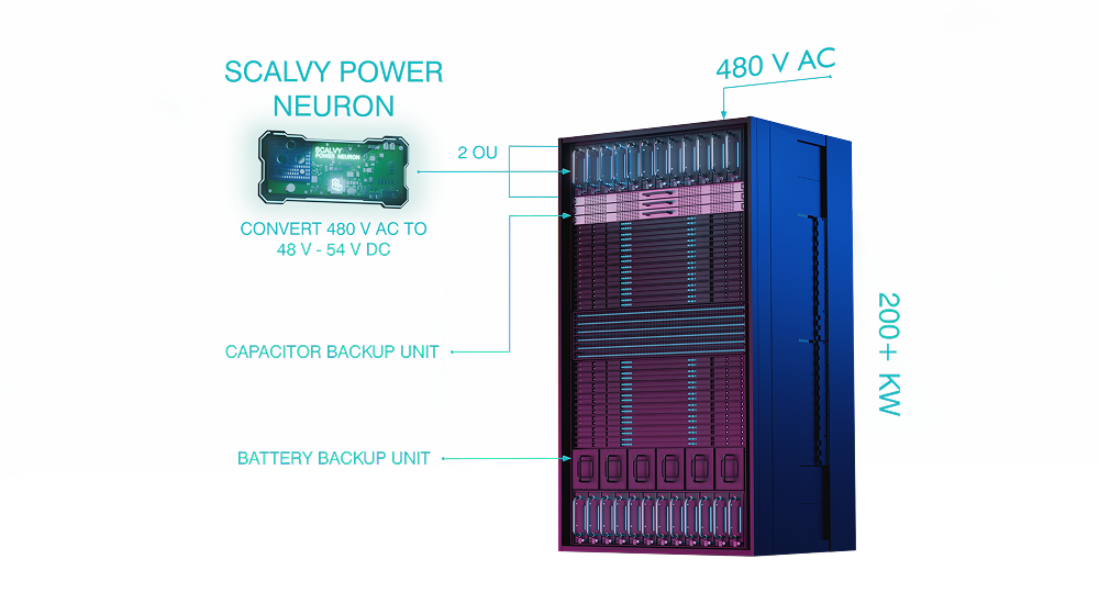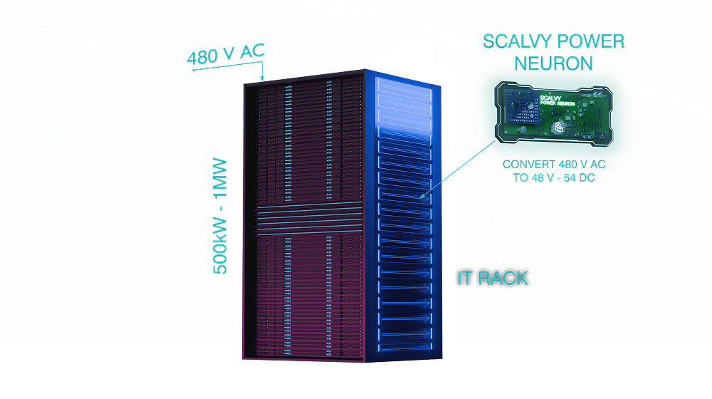 Power Neurons drop into server trays or replace power shelves to enable 1MW racks with storage without crowding out GPUs or requiring HVDC. Scalvy drives compute revenues and faster time to market for AI data centers while delivering a more predictable load to the grid.