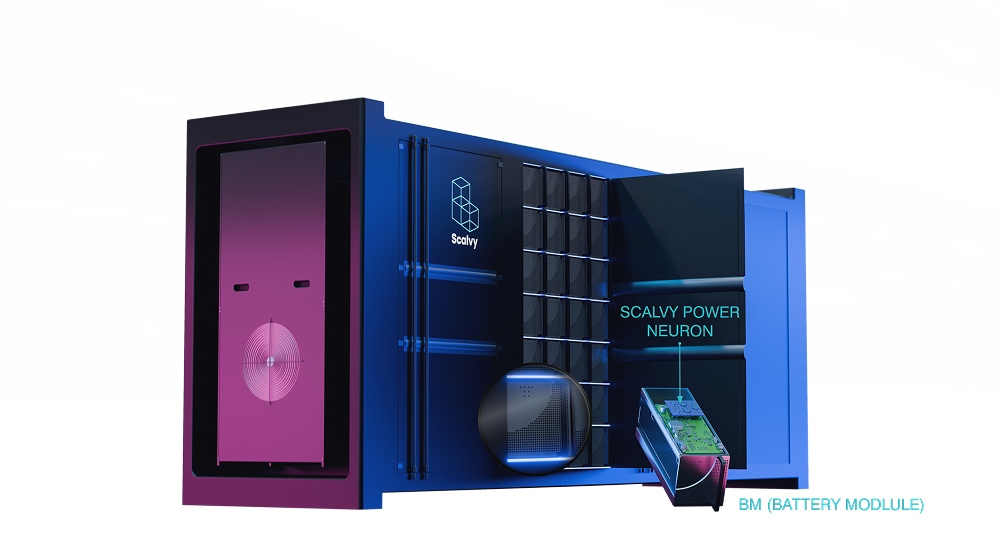 Scalvy delivers 30+% more revenue per site for grid-scale and commercial energy storage. Power Neurons integrate with each battery pack or replace rack-level String PCS in AC blocks, delivering more usable energy and 99.9% availability in a smaller footprint