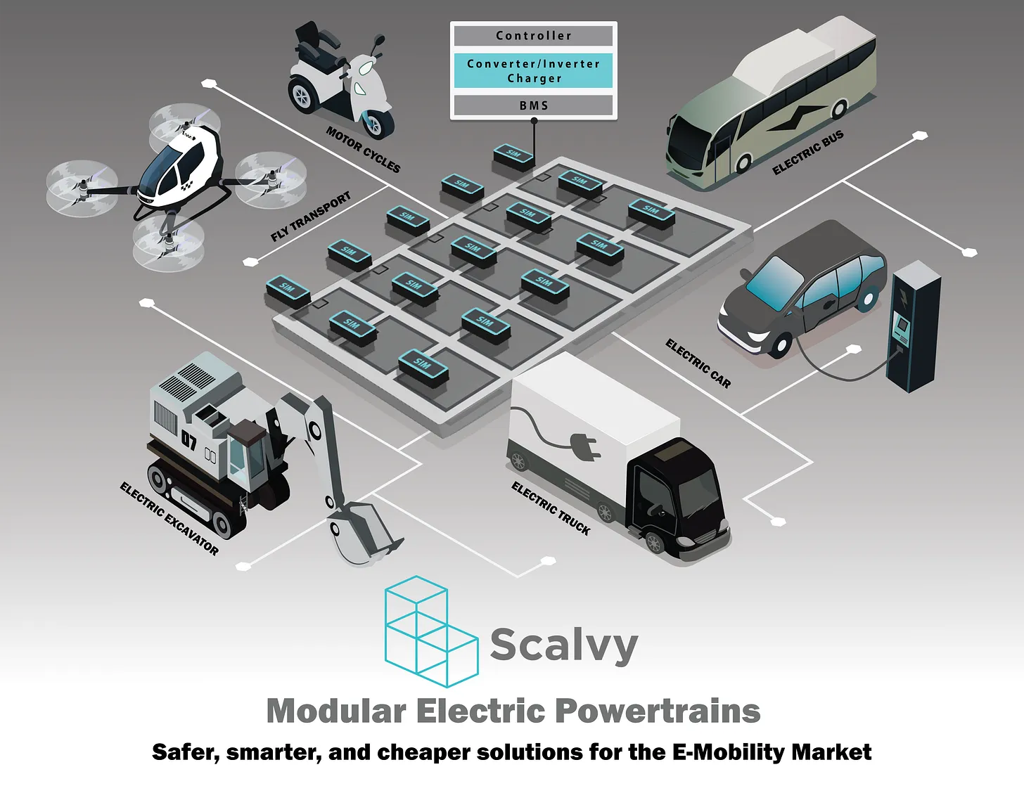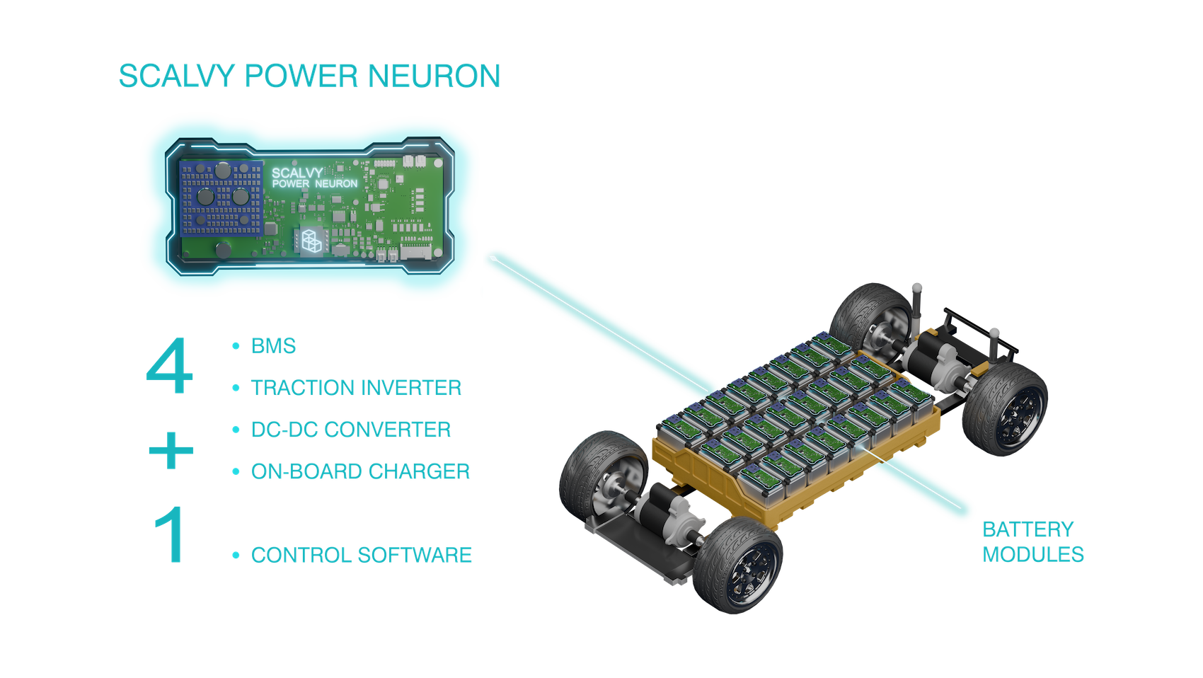 Scalvy enables higher-power, longer-life electric powertrains for commercial vehicles and heavy machinery. Power Neurons integrate with each battery pack to deliver 600 A+ per-phase capability, faster charging, and longer battery life in a scalable architecture.