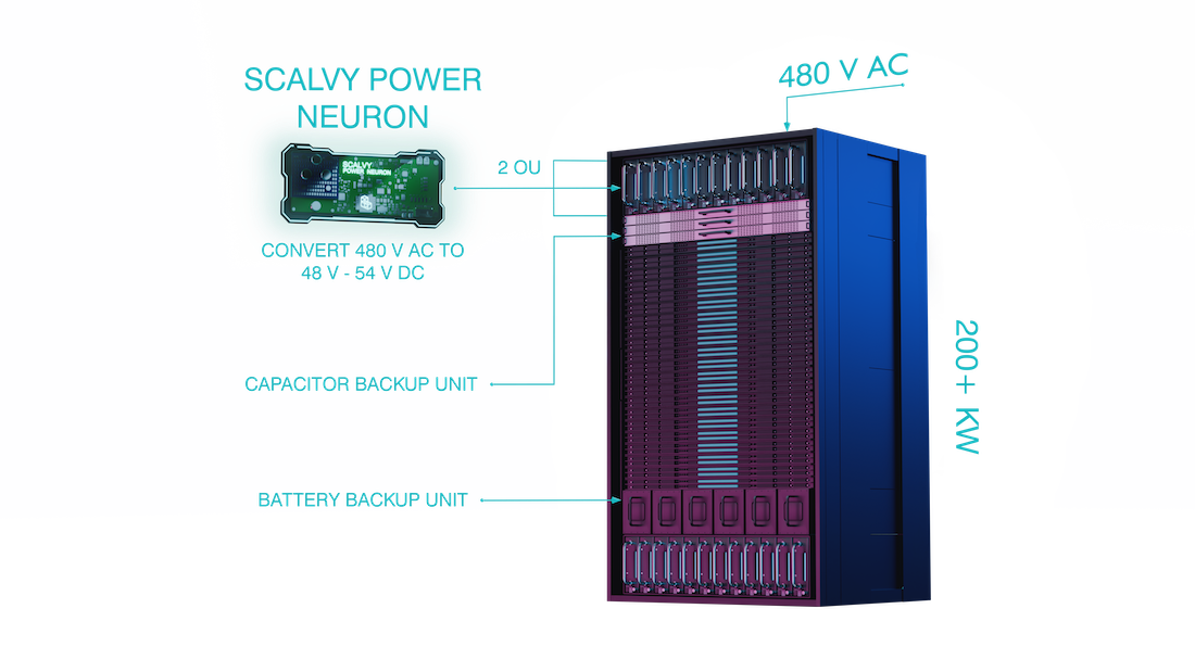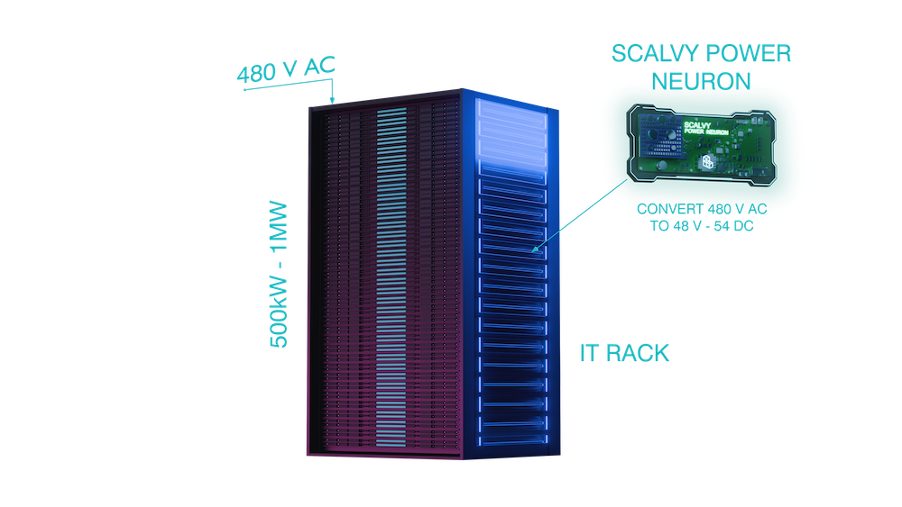 Power Neurons drop into server trays or replace power shelves to enable 1MW racks with storage without crowding out GPUs or requiring HVDC. Scalvy drives compute revenues and faster time to market for AI data centers while delivering a more predictable load to the grid.